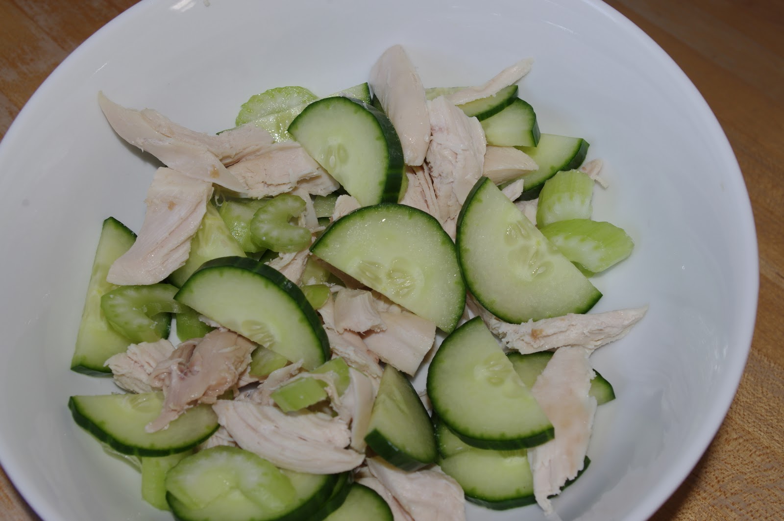 Per the recipe instructions I shredded some of the chicken breast and tossed it with some thinly sliced celery and sliced English cucumber.