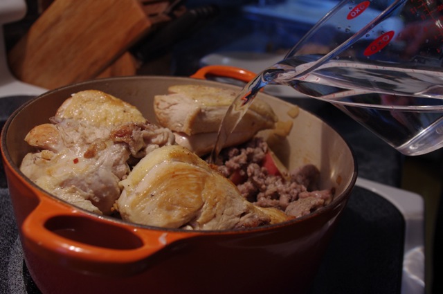 Return sausage and chicken to the pot, add 1 cup of water. Bring to a boil, cover, reduce heat to low. Simmer until chicken is cooked through. The recipe says 20 min. It took more like 30 min.