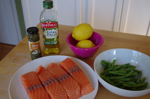 This recipe needs only a few simple ingredients. Salmon fillets (6oz each), green beans (trimmed of ends), lemon, capers (rinsed and drained), salt and pepper, and extra virgin olive oil.