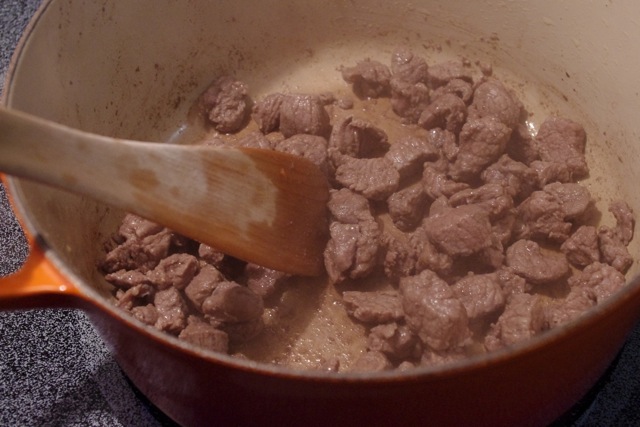 In remaining oil brown 1 pound or so of stew meat. The Family never complains if there's more beef. They will point out if there is less!